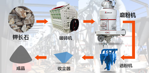 鉀長石大塊物料經(jīng)破碎機(jī)破碎到能進(jìn)入磨粉機(jī)的入料細(xì)度(15mm-50mm)。