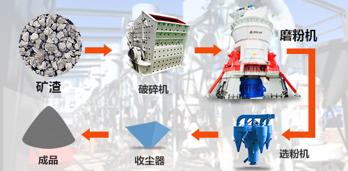 大塊爐渣經(jīng)破碎機破碎到能進入磨粉機的入料細度(15mm-50mm)。