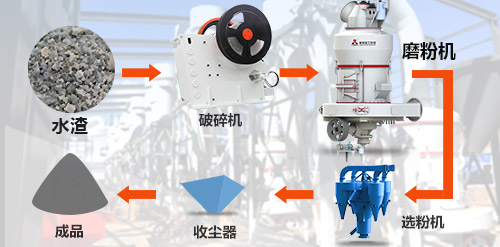 大塊水渣經(jīng)破碎機(jī)破碎到能進(jìn)入磨粉機(jī)的入料細(xì)度(15mm-50mm)。